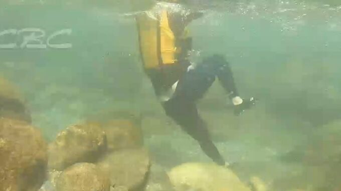 「今は普通に足がついていて、同じ深さの川底が続いているように見えるのですが、一度歩いて見ます。あ、全然足がつかないです、急に」