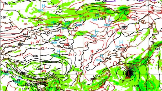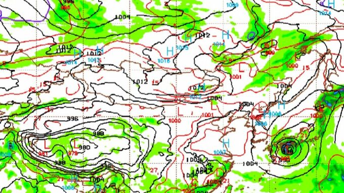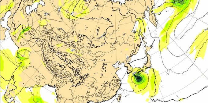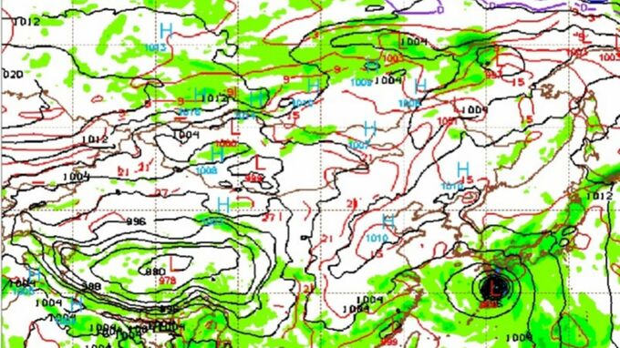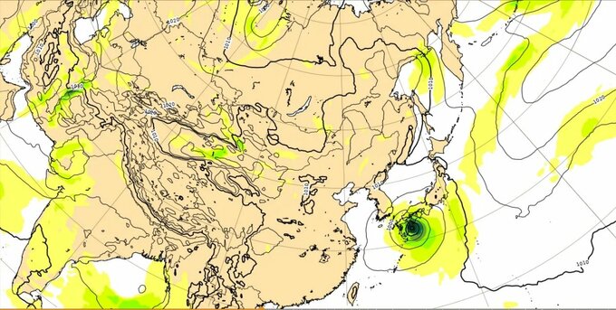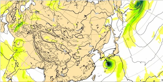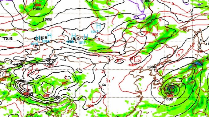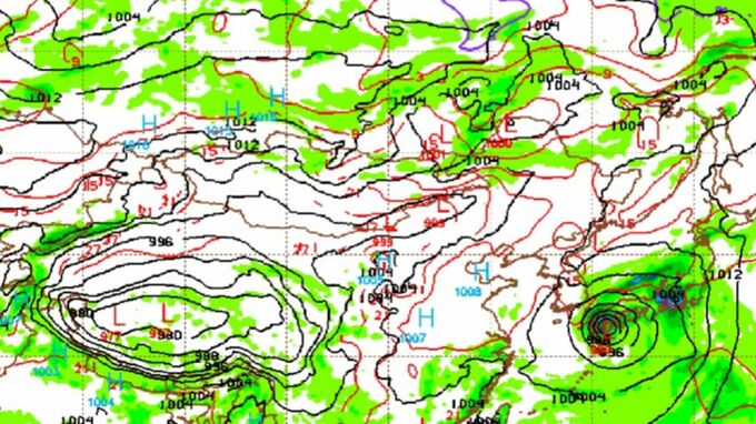 ヨーロッパ中期予報センターの上空1500m付近の強風エリアや、海面気圧の予想を見ると、29日(木)ごろに西日本で停滞する予想です。