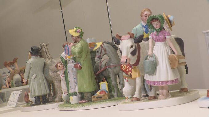 東区の横山美術館で始まった「華麗なる陶人形展」では、昭和20年代から平成までの輸出品を中心とした作品約200点が展示され、アメリカで人気のイラストレーター、ノーマン・ロックウェルのイラストを瀬戸焼で立体化した作品などが並びます。
