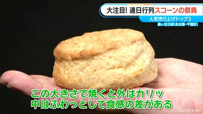 「こちらがブリティッシュプディングの一番人気『田舎の大きなスコーン』(389円)です。これが現地の大きさで、この大きさで焼くと外はカリッ、中はふわっとして食感の差がある。粉をそのまま口の中に感じてもらえるのも、この大きさの魅力」
