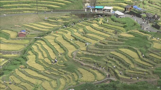 風光明媚な1340枚の棚田で秋の収穫 “丸山千枚田”で300人のオーナーらが稲刈り 2024年9月14日(土) 20:03 国内 風光明媚な棚田として知られる三重県熊野市の「丸山千枚田(まるやませんまいだ)」で稲刈りの集いが行われました。熊野市の丸山千枚田は高低差100mの山あいの斜面に大小1340枚もの水田が重なる全国有数の棚田です…
