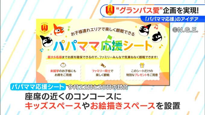 後日、グランパスから発表されたのが「パパママ応援シート」。9月22日と28日、2試合連続で座席の近くのコンコースに、キッズスペースやお絵描きスペースを設置し、試合観戦中でもスタジアム内で、子どもが遊べる取り組みにトライします。