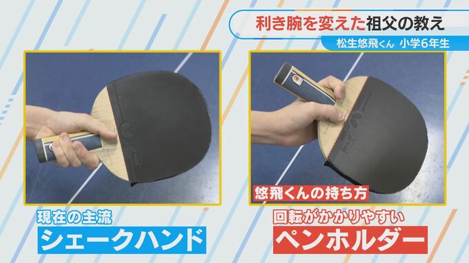 悠飛くんの強みはそれだけではありません。卓球界では現在、シェークハンドと呼ばれる握手をするような持ち方が主流なのですが、悠飛くんはペンホルダーというより回転のかかり易い持ち方をしています。