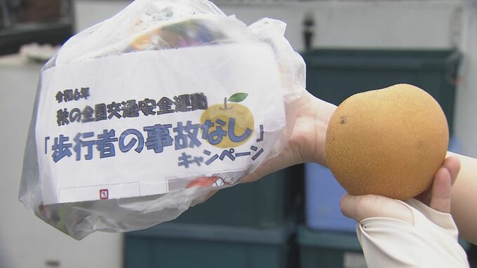 秋の全国交通安全運動にあわせ「歩行者事故なし」と梨をかけて、訪れた人に事故防止を呼びかけました。