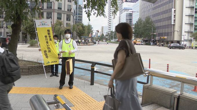 9月21日に始まった「秋の全国交通安全運動」に合わせて行われたもので、自転車の一時停止を呼びかけるポスターが掲載された1袋300グラム入りの「愛ひとつぶ」約500袋を通行人に配った他、ドライバーに飲酒運転や携帯電話の使用をしないように呼びかけました。