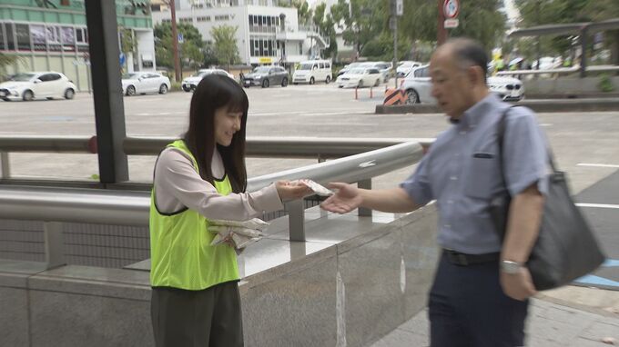 25日朝、名古屋の街頭でコメを配って交通安全を呼びかける啓発活動が行われました。