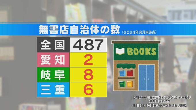 出版文化産業振興財団の調査によると「無書店自治体」は全国に487。東海地方では愛知に2つ、岐阜と三重はそれぞれ8つと6つとなっています。