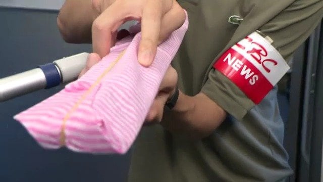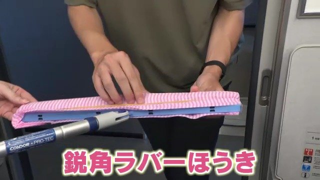「鋭角ラバーホウキというものです。ドレッサーのアイデアから生まれた。とがった部分でごみを集めてぬれている部分があれば面を使う」
