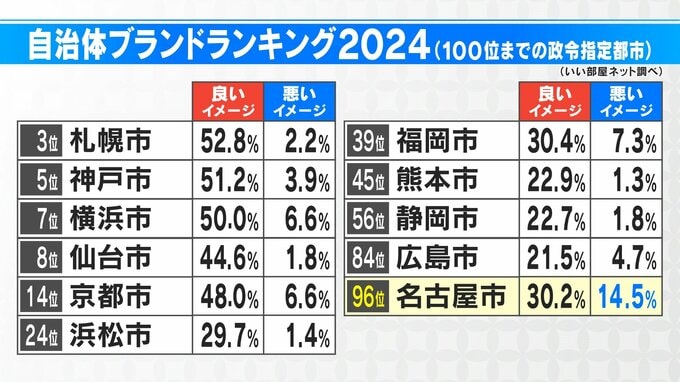 ところが名古屋より上位の政令指定都市は、「悪いイメージ」が全て1ケタなのに対して、名古屋は唯一2ケタの14.5%。トップの札幌市が2.2%ですから圧倒的に悪いんです。