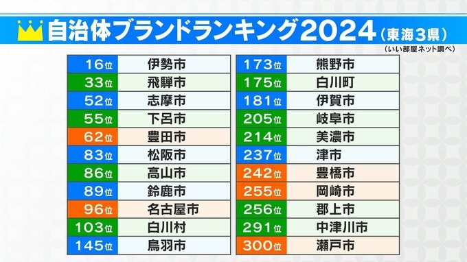 全国には1700の自治体がありますから、300位に入ったら立派なものなんですが、三重県のトップは16位の伊勢市、続いて岐阜県のトップは33位の飛騨市、そして愛知県のトップは62位の豊田市となっています。