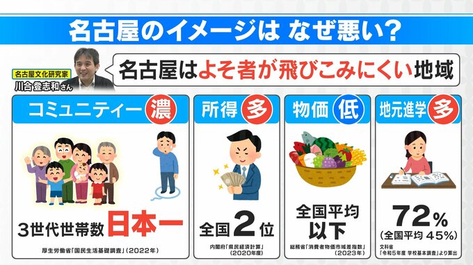 そういうことなんです。名古屋市がある愛知県のデータを見てみますと、「3世代の世帯数」が日本一。おじいちゃん世代・お父さん世代・子ども世代で、それぞれコミュニティーがしっかりできているので、そこに入りにくいのではと。
