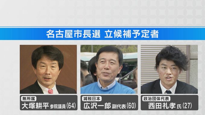 名古屋市長選にはこれまでに、無所属の大塚耕平参議院議員と、前副市長で減税日本副代表の広沢一郎氏、政治団体代表の西田礼孝氏が立候補を表明しています。