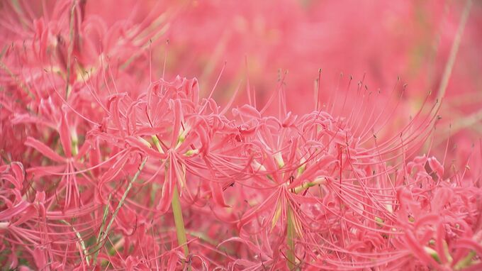 児童文学者、新美南吉の代表作「ごんぎつね」の舞台である矢勝川沿いには約300万本のヒガンバナが植えられています。ことしは9月に入っても、猛暑が続いたためか、例年より遅れて開花しました。