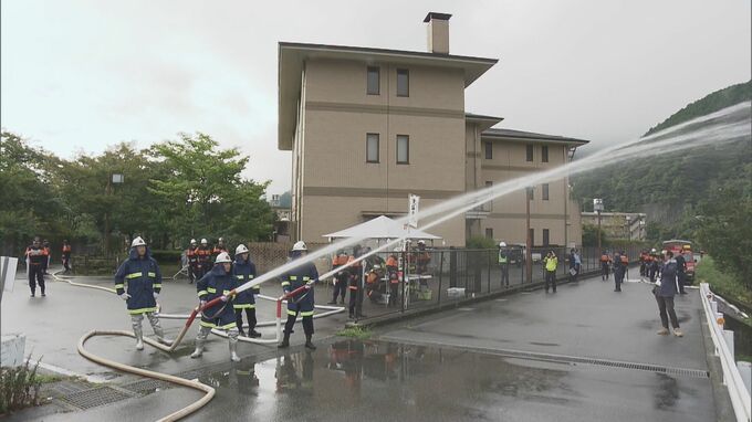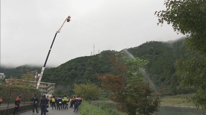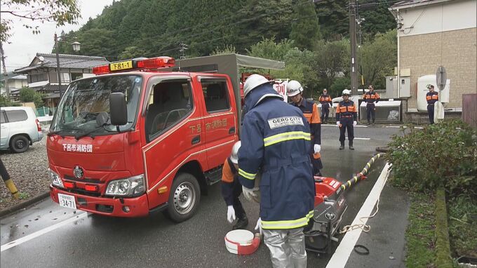 6日の訓練には下呂市消防本部と地元の消防団合わせておよそ100人が参加し、近くを流れる飛騨川からポンプ車で吸水したり、温泉街での密集地火災を想定して「はしご車」による高所からの放水訓練も行われました。