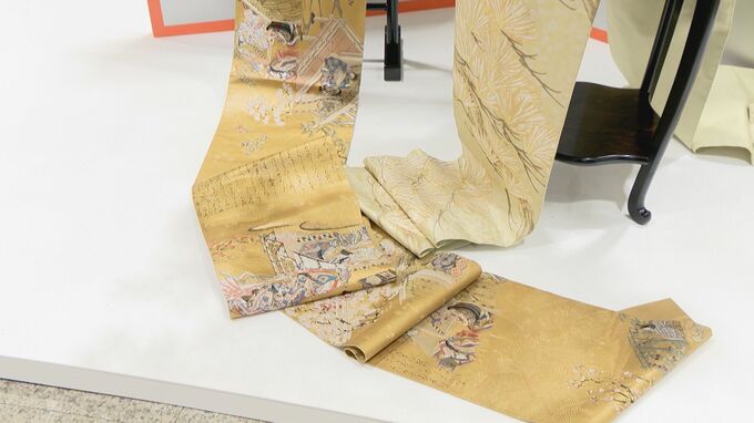 102年の歴史を持つ「石田流」の、四代家元 石田巳賀さんが取り上げたのは、「松風」の帖。源氏物語が描かれた帯と、色づいたモミジやキク、リンドウなど秋の草花の競演です。