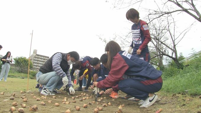 花のある街づくりに一役です。女子サッカー・なでしこリーグの選手らが、愛知県瀬戸市の河川敷にスイセンの球根を植えました。