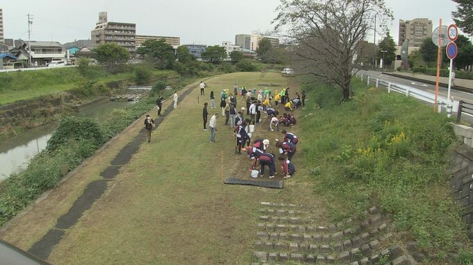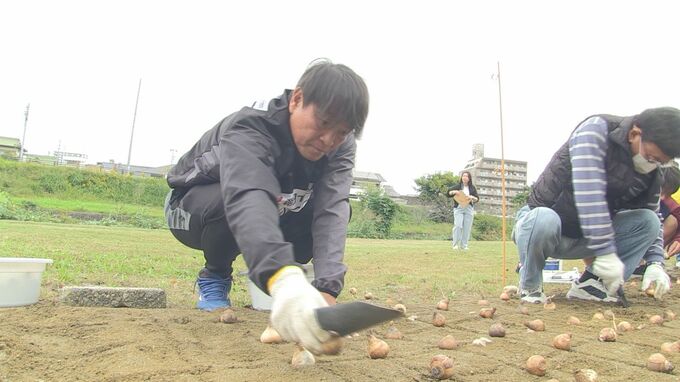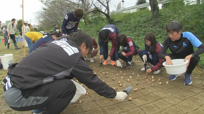 球根を植えたのは瀬戸川の河川敷で、なでしこリーグの「朝日インテック・ラブリッジ名古屋」の選手や、地元の住人ら約40人が参加しました。