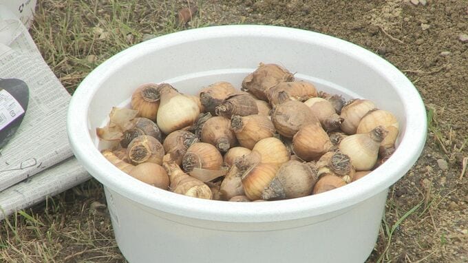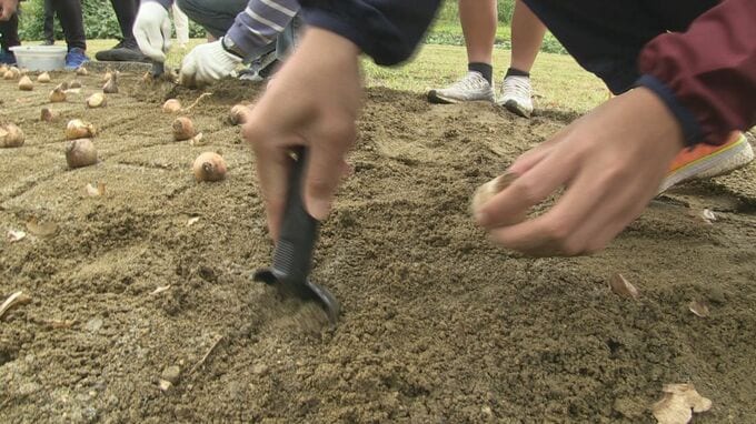 チームを支援する、医療機器メーカー朝日インテックの環境推進活動の一環で、植えた球根の数は、今シーズン3位だった勝利数「13」にちなんで13ケース、約1300個です。