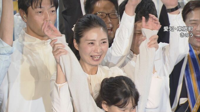 27日夜、小学4年生の長女・杏南ちゃんと万歳をした、注目区・愛知7区で初当選を果たした国民民主党の新人・日野紗里亜さん36歳。