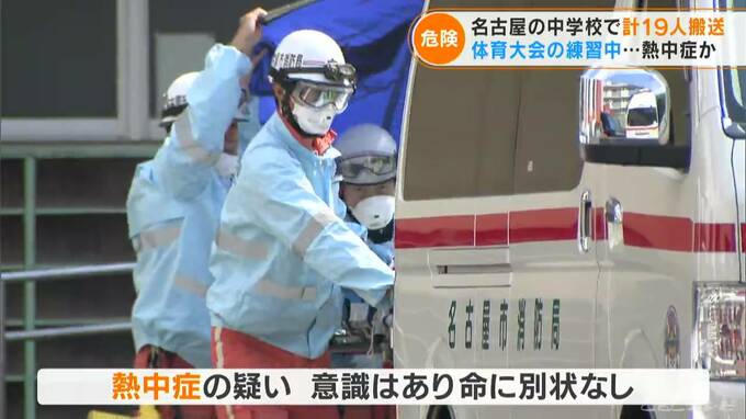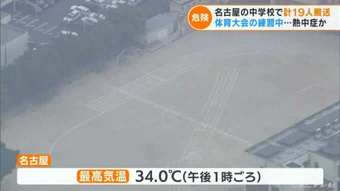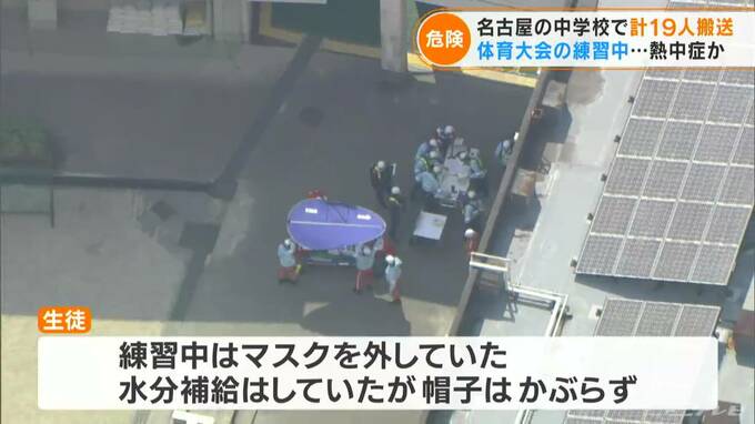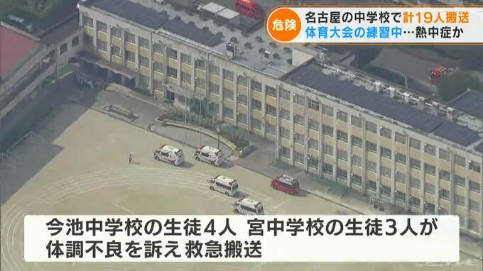 また、同じく体育大会の練習をしていた、名古屋市千種区の今池中学校で1年生の生徒4人が、名古屋市熱田区の宮中学校では、3年生の生徒3人が体調不良を訴え、救急搬送されました。