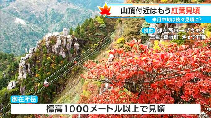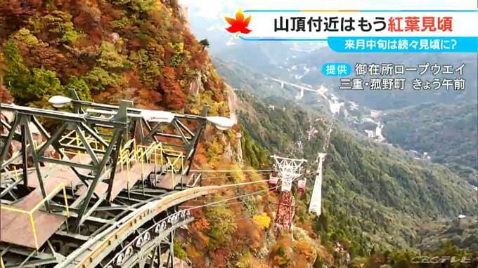 そして、三重県の御在所ロープウェイ。御在所岳は標高1200m以上ありますが、標高1000m以上の山頂付近のところが今一番の見頃ということで、ツツジなどの葉が鮮やかに赤く染まっています。