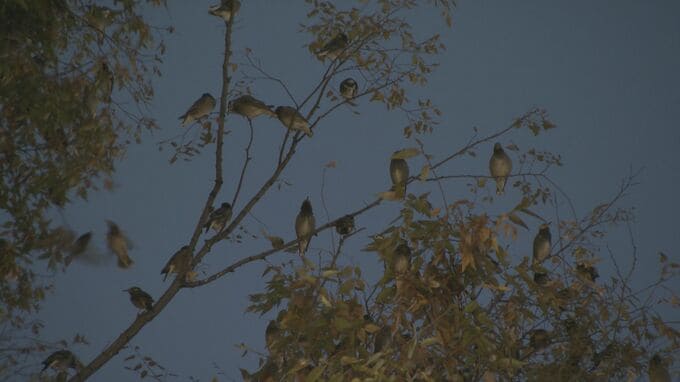まるで発砲したような大きな音。これに反応して、木から離れるムクドリもいましたが…