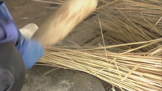 高山市の飛騨一宮水無神社では、17日朝から氏子らおよそ30人が集まり、藁を木槌で何度もたたいて柔らかくし、境内などに飾るしめ縄を手際よく仕上げていきました。