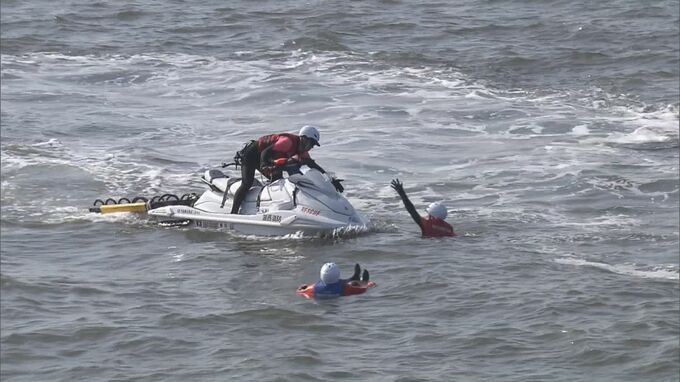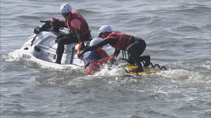 豊橋市、田原市、西尾市、常滑市と、県内全ての水上オートバイ隊が参加する訓練は初めてで、静岡県湖西市の消防も参加。連携して救助の手順を確認しました。