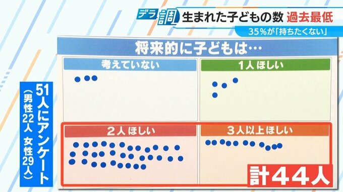 名古屋の街で、将来的に子どもが何人欲しいか聞いてみました。男性22人、女性29人の計51にアンケートしたところ、44人が子どもを「2人以上」希望すると回答。