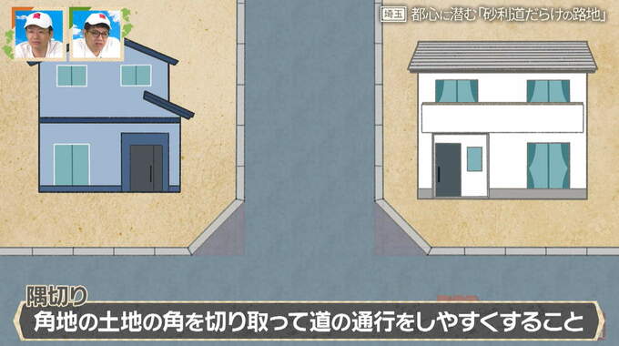 道を市に返還する話もありましたが、住宅が密集し道幅が狭く、角地である土地の角を切り取って空地にする隅切りが確保できなかったため、現在も私道のままに。
