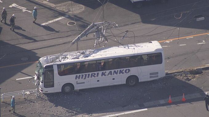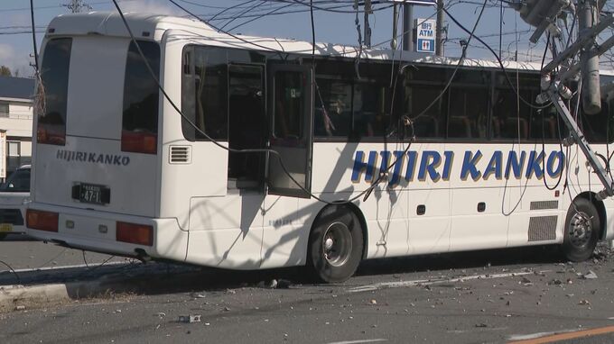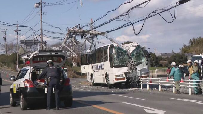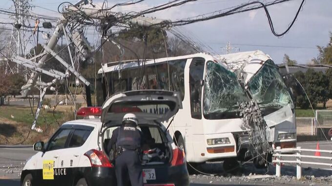 8日午前11時半ごろ、愛知県半田市柊町の交差点で、「事故で電柱が折れ曲がっている」と目撃者から消防に通報がありました。この事故で、バスに乗っていた約30人のうち、運転手の50代の男性と、乗客あわせて4人が軽いけがをしました。