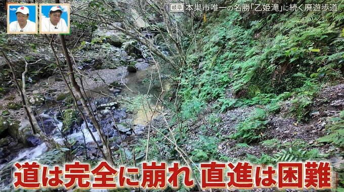 3人は情報を求め、一帯の土地を所有する方にお話を伺うことに。すると、土地の所有者のご先祖が約40年前まで川沿いでキャンプ場を経営していたことが判明。3人が見た謎の建物は、そのときのものだそう。しかし、次第に客足が遠のき、造った乙姫滝への遊歩道は今の状態になったと言います。