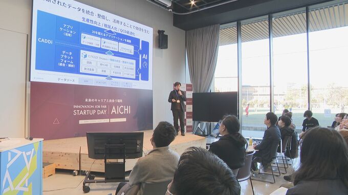名古屋市昭和区にあるスタートアップ企業の支援拠点、「STATION Ai」で開かれたこのイベントには、愛知県を中心とした国内のスタートアップ企業22社が参加しました。イベントでは企業が1社ずつ登壇し、来場者に向けて展開する事業や今後の展望、求める人材などを説明しました。