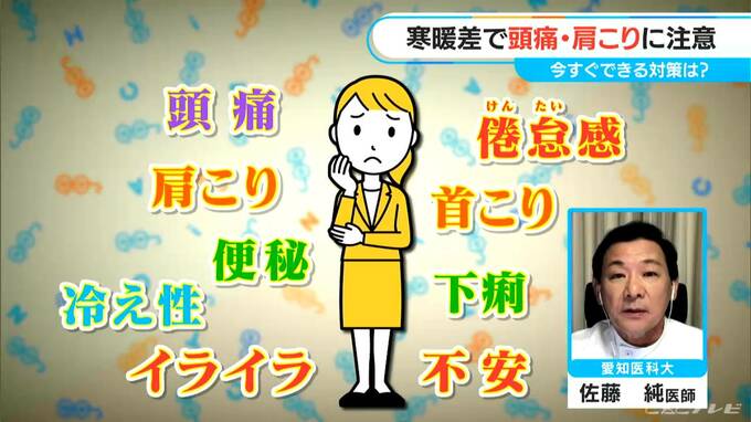 「寒暖差疲労によくあるのは、全身の倦怠感とか冷え性、頭痛、肩こり首こり、便秘とか下痢とか。イライラや不安などの精神症状が出る場合もあります」