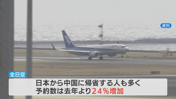 また、全日空によりますと、ことしの春節期間は中国からの訪日客だけでなく、日本から中国に帰省する人も多いため、予約数は去年より24%増加したということです。