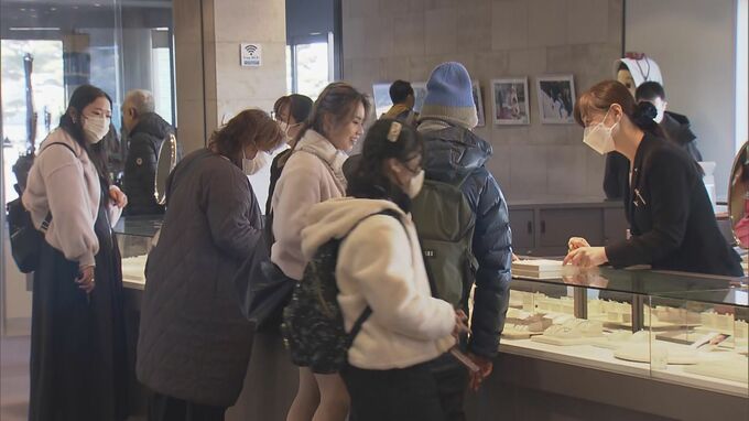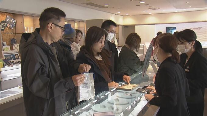 28日のミキモト真珠島は数年前に「爆買い」という言葉が広がった時ほどの光景ではありませんでしたが、円安でリーズナブルな日本の真珠を求めて多くの外国人観光客がショッピングを楽しんでいました。