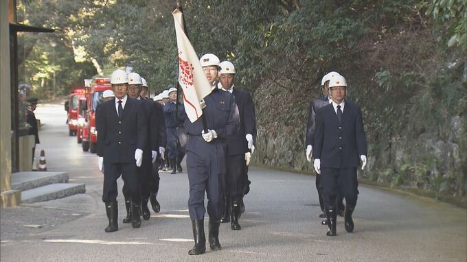 30日は神宮神職や神宮消防組員およそ80人が出席し式典を行った後、旗を先頭に消防車5台と行進しました。