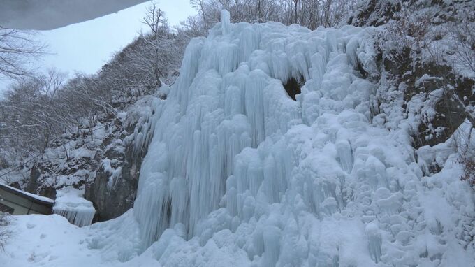 岐阜県高山市で、山肌に青白い氷の柱が連なる「氷の渓谷」が見ごろを迎えています。