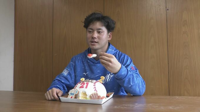練習終了後、金丸投手には大きな誕生日ケーキが贈られた。「こんな大きいケーキを用意してくださって嬉しいです。新鮮な気持ちで、良い一年にできたら」と笑顔で語った。