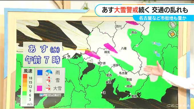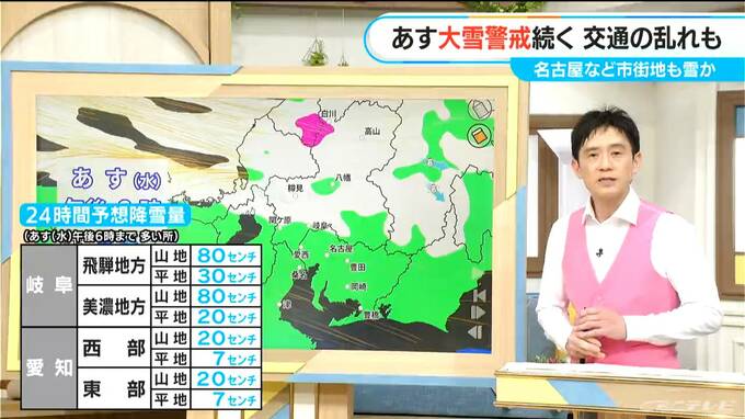 5日午後6時までに予想される雪の量は、岐阜県の山地では80センチ、飛騨地方の平地で30センチ、美濃地方の平地で20センチ、愛知県では山地で20センチ、平地で7センチで、特に濃尾平野の岐阜県との県境付近で積雪になりそうです。