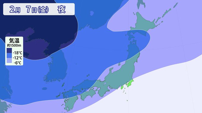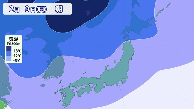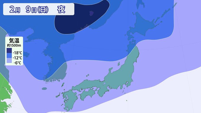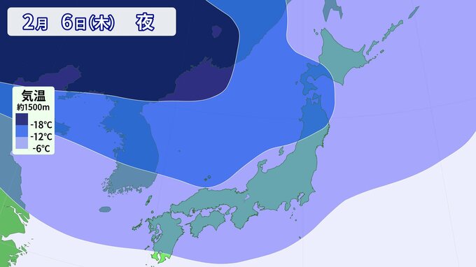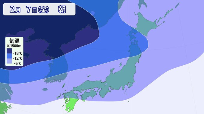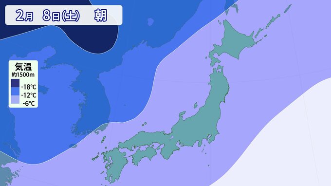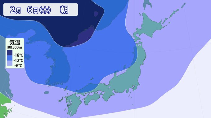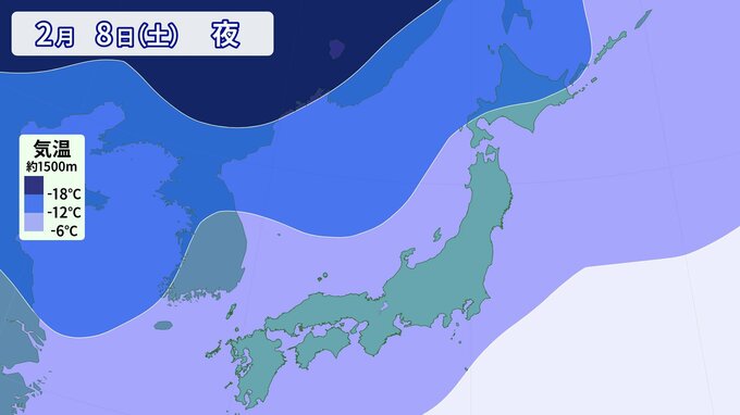 まず、寒気の予想です。 上空1500m付近で-6℃以下の寒気は、平地でも雪になる目安の寒気ですが、その寒気がすっぽりと日本列島を覆っています。 今回の寒波は「長い」のが特徴で、週末まで日本の上空に居座る可能性があります。