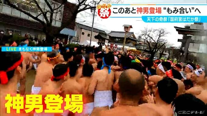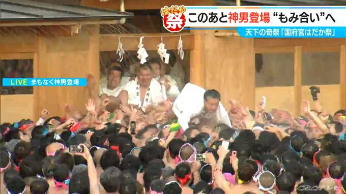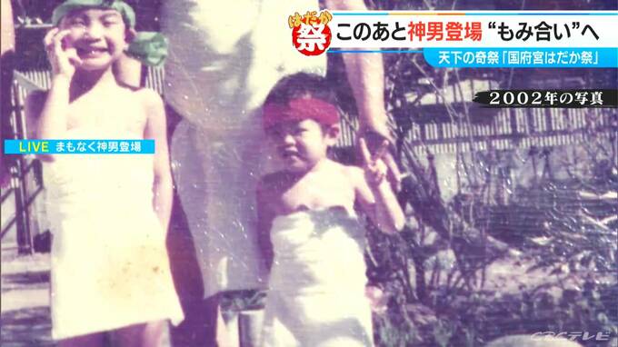 参道の中に、どこからともなく登場するのが「神男」。去年は午後4時20分ごろのことでした。神男めがけて、はだか男たちが突進!そして…