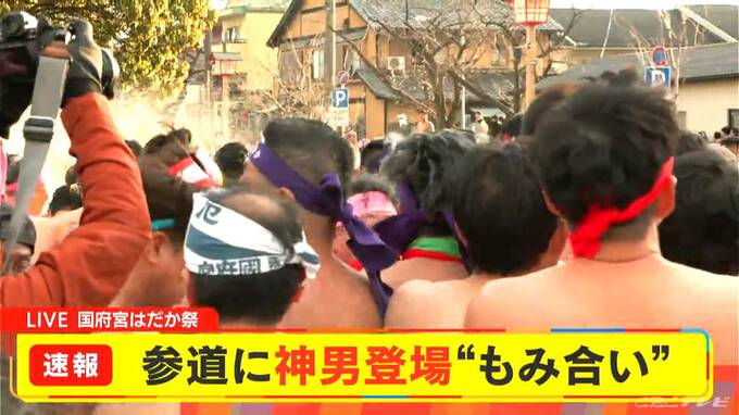 【速報】国府宮はだか祭 参道に神男が登場(午後4時31分)迫力のもみ合いへ 愛知・稲沢市 2025年2月10日(月) 16:40 国内 愛知県稲沢市の国府宮で行われている「はだか祭」は、午後4時31分、祭の主役の「神男」が参道に登場しました。この後「神男」は楼門をくぐって儺追殿(なおいでん)を目指し、神男に触れようとする、はだか男たち…