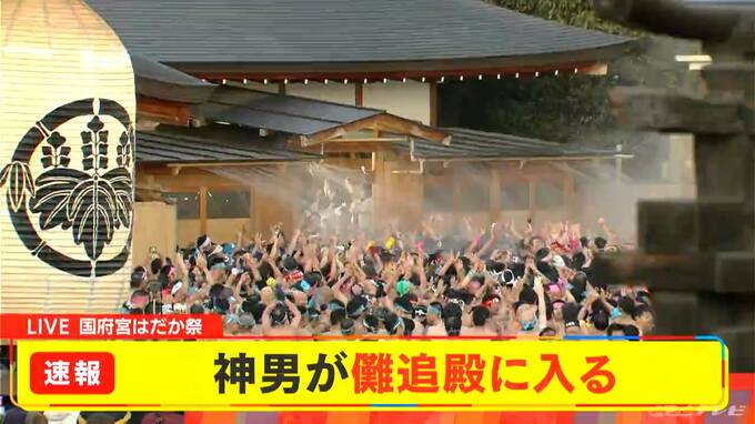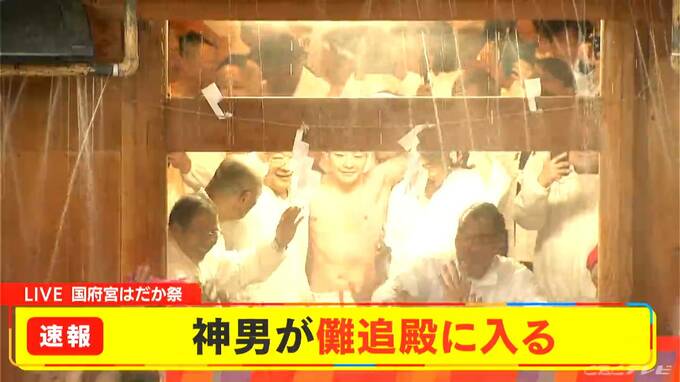 10日に、愛知県稲沢市の国府宮で行われている天下の奇祭「はだか祭」。祭の主役「神男」は、午後5時半頃に儺追殿(なおいでん)に入りました。