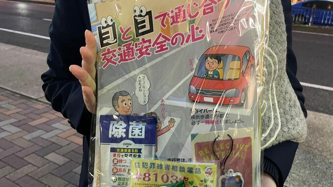 生徒たちはドライバーに横断歩道での一旦停止の徹底を呼びかけるチラシや反射材などをチョコレートと一緒に配って交通安全を呼びかけました。