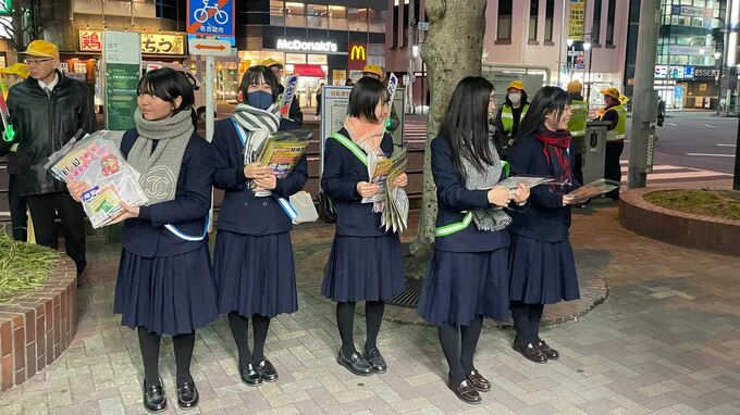 名古屋市千種区で行われた啓発活動には椙山女学園高校と菊里高校の生徒や警察官およそ50人が参加。