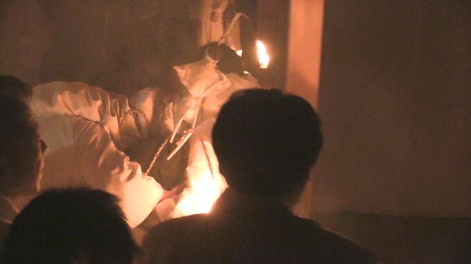 11日午前3時からは、神男の加藤稜大さん(26)にあらゆる厄をつぎ込んだ「土餅」を背負わせて神社の外へ追い出し、平穏を願う「夜儺追神事」が行われました。
