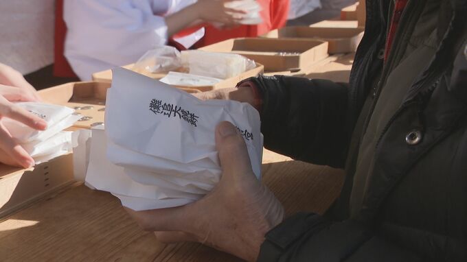 一夜明けた午前9時ごろからは、神社に奉納されていた重さ4トンの大鏡餅が神職らによって切り分けられました。食べるとその年を無病息災で過ごせると言われ、大勢の参拝者が買い求めました。
