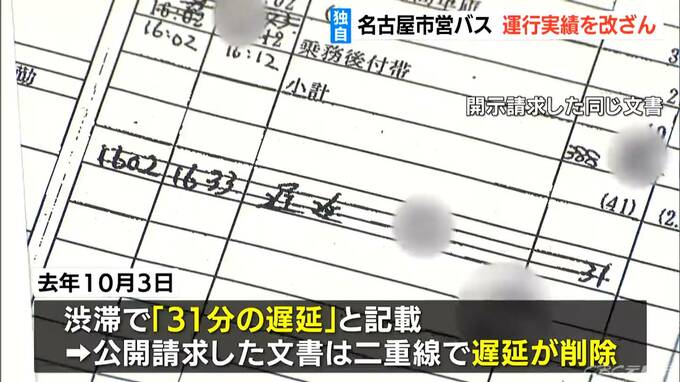 CBCが関係者から入手した、名古屋市営バスのルートや所要時間などが記録された行政文書。去年10月、渋滞で31分の遅れが出たと書かれていますが、同じ文書を公開請求すると二重線で消されています。