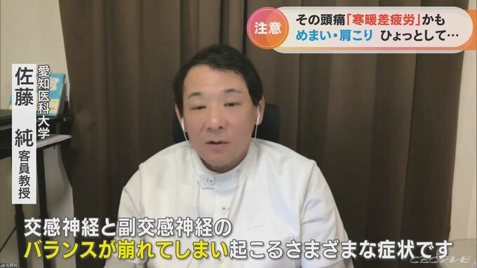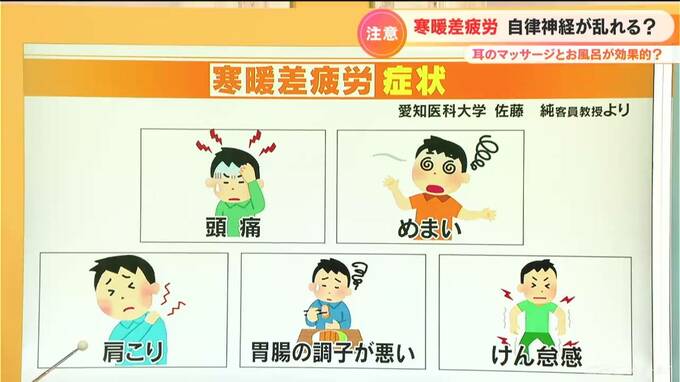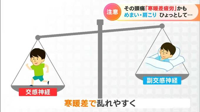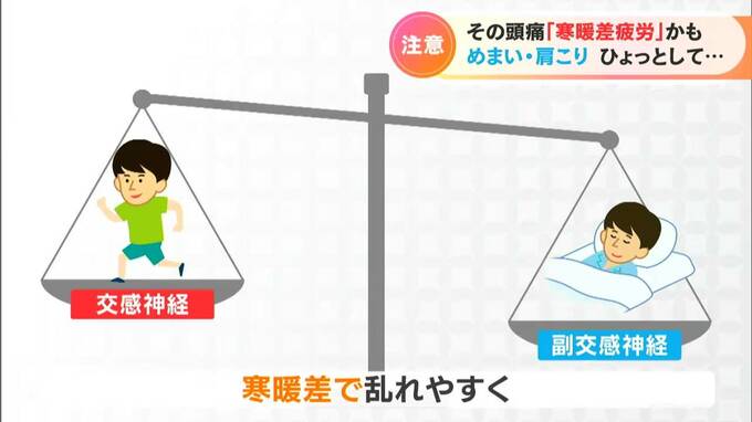 愛知医科大学の客員教授佐藤純医師によりますと、興奮した時や活動している時に優位になる「交感神経」と、リラックスしている時に優位になる「副交感神経」が寒暖差が生じると乱れやすいとのこと。